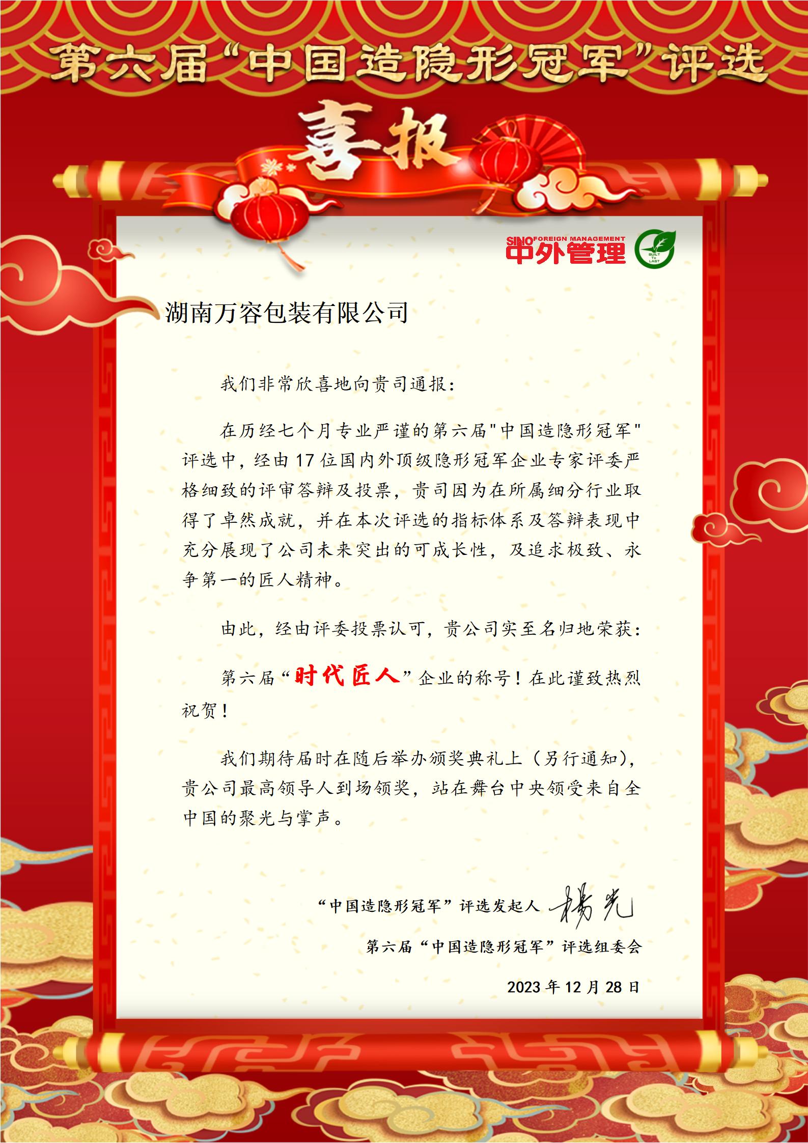 第六屆“時(shí)代匠人”企業(yè)的稱號(hào)!